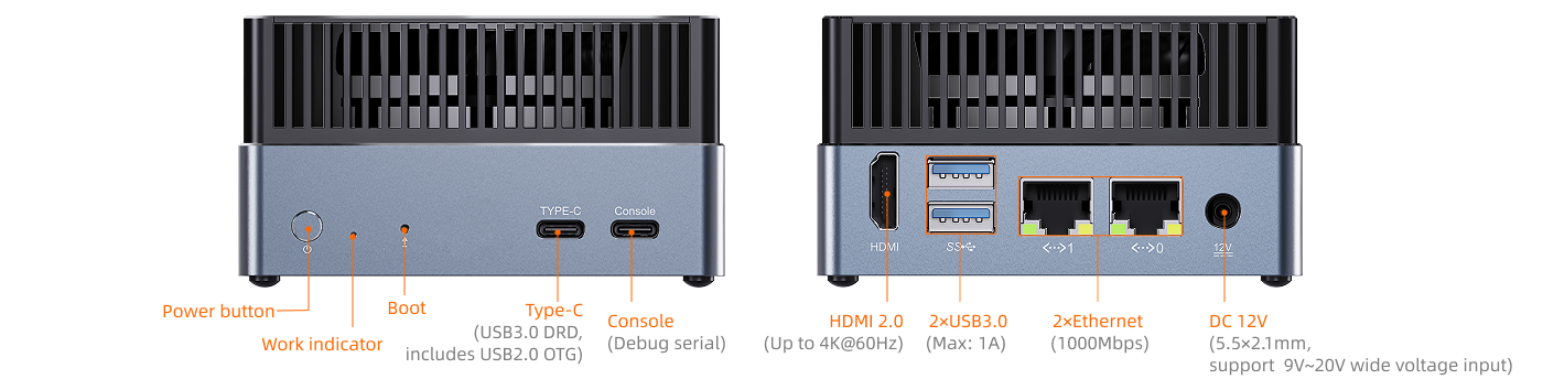 2 × USB3.0 (Max: 1A), 1 × USB3.0 DRD (Type-C, includes USB2.0 OTG) |