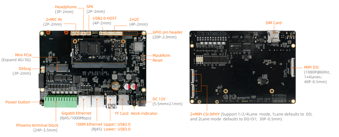 1 × USB2.0 HOST (Max: 0.5A), 1 × USB3.0 DRD (Max: 1A), 1 × USB2.0 HOST (Wafer socket, 4Pin-2mm) |
