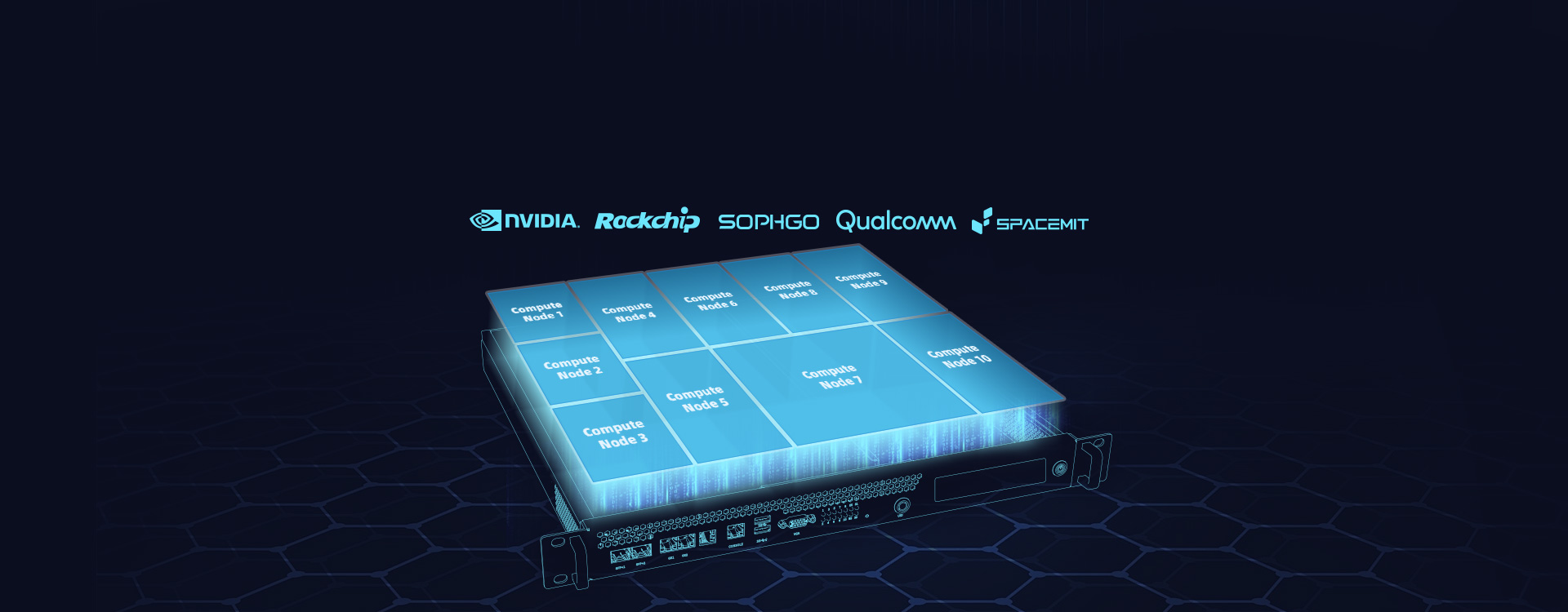CSB1-N10 Integrates 10 distributed computing nodes with comprehensive processor support, including Rockchip, SOPHGO, NVIDIA, Qualcomm, and SpacemiT. Each node delivers 6-157 TOPS of computing power, with configurable node quantities to provide robust acceleration for AI and deep learning workloads.