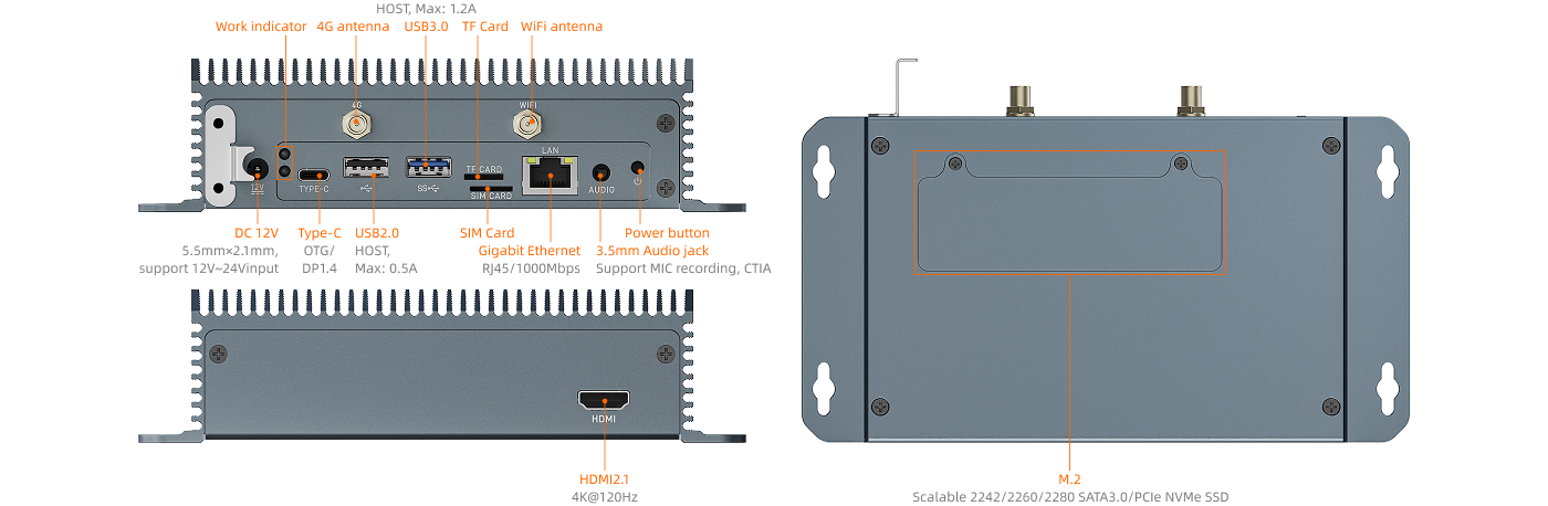 1 × USB3.0 (HOST, Max: 1.2A), 1 × USB2.0 (HOST, Max: 0.5A), 1 × Type-C (OTG/DP1.4) |