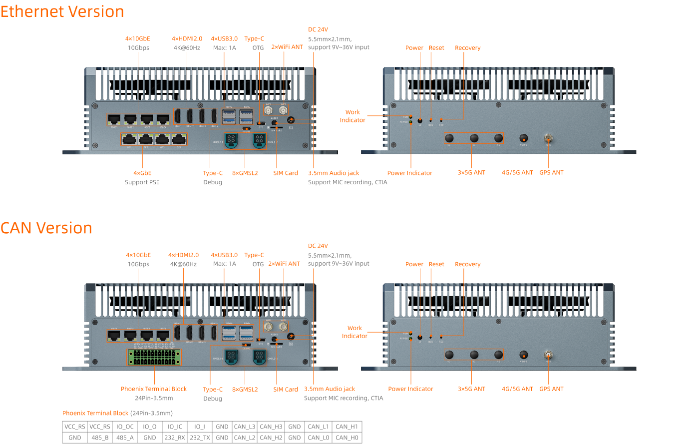Ethernet Version: 4 × 10G Ethernet (RJ45), 4 × Gigabit Ethernet (RJ45, support PSE) CAN Version: 4 × 10G Ethernet (RJ45) |