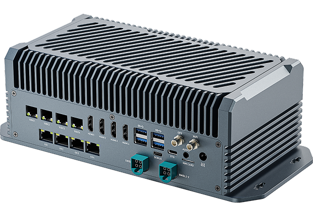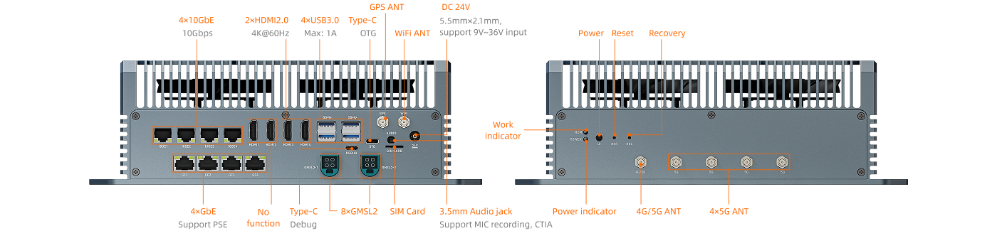 Equipped with NVIDIA Jetson Thor series Jetson T5000 module, it delivers up to 2070 TFLOPS of computing power and supports various large AI models. It enables 92-channel 1080P video decoding and 50-channel 1080P video encoding. It is equipped with both four 10-gigabit Ethernet ports and four gigabit Ethernet ports. Designed with an industrial-grade all-aluminum casing and dual cooling fans, it ensures stable 24/7 operation.