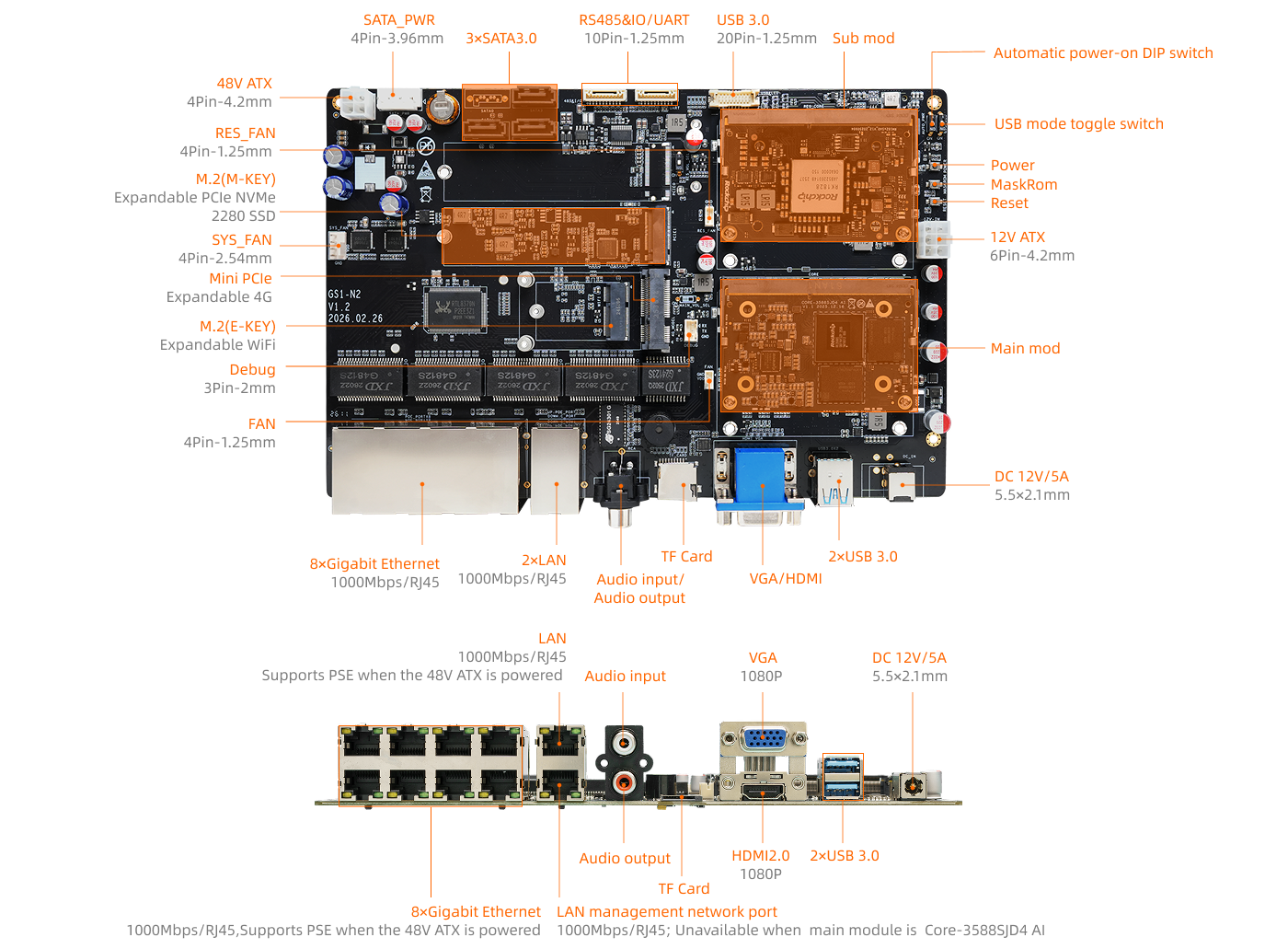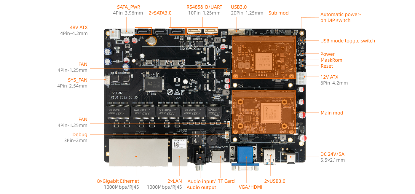 8 × Gigabit Ethernet (RJ45): Supports PSE functionality. After connecting an external 48V ATX power supply, it can provide PoE power to terminal devices. 2 × LAN (RJ45, 1000Mbps): Upper LAN ports support PSE functionality. After connecting an external 48V ATX power supply, it can provide PoE power to terminal devices. Lower LAN is the management port, which is unavailable when the main module is Core-3588SJD4 AI. Supports 2.4GHz/5GHz dual-band WiFi (expanded via M.2 E-KEY, shared with SATA0; M.2 E-KEY not populated by default) |