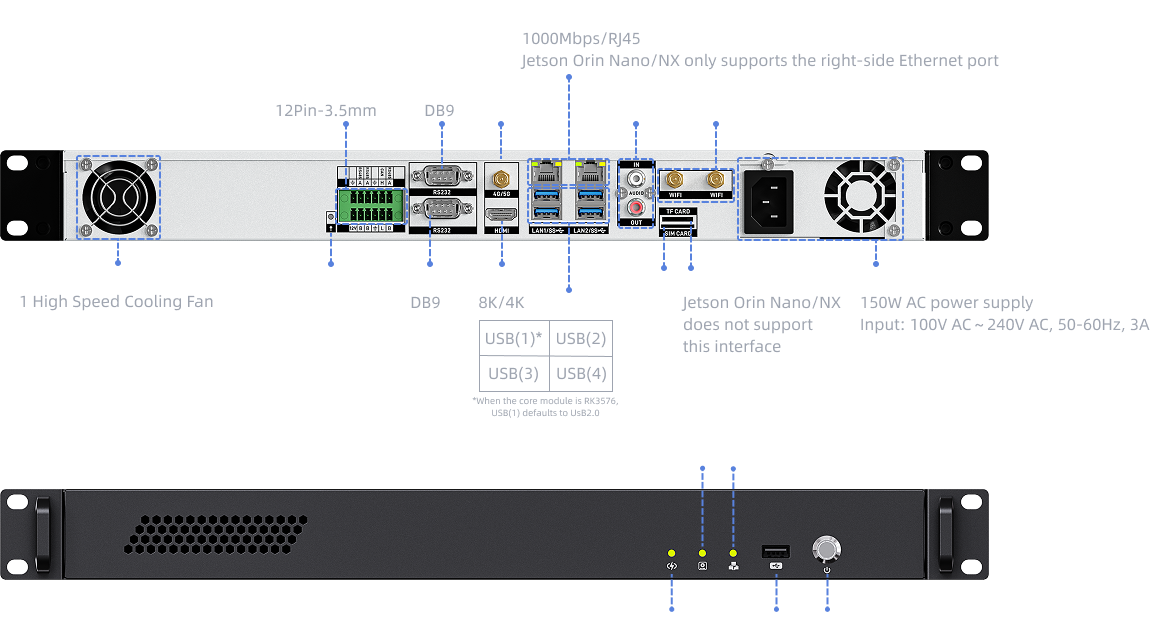 | Storage expansion | 1 × SATA3.0 (Extended 3.5'' or 2.5'' SSD/HDD; This interface is not available when the core module is Jetson Orin Nano or Jetson Orin NX) 1 × M.2 M-KEY(ExtendedPCIe NVMe2280 SSD) 1 × TF Card (This interface is not available when the core module is Jetson Orin Nano or Jetson Orin NX) | ||||||||||||||||||||||||||||||